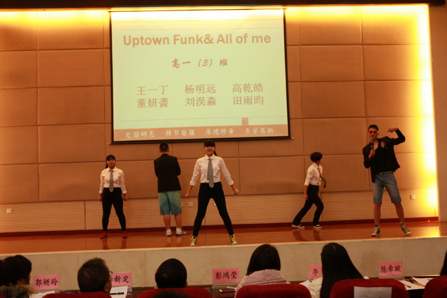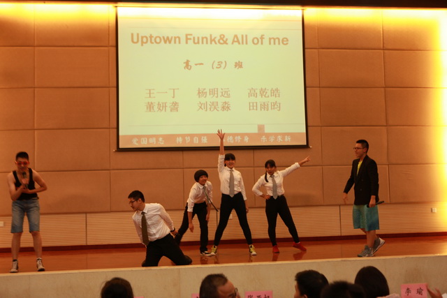 高2018届3班王一丁、杨明远、高乾皓、董妍詟、刘淏淼、田雨昀演唱英文歌曲《Uptown Funk& All of me》