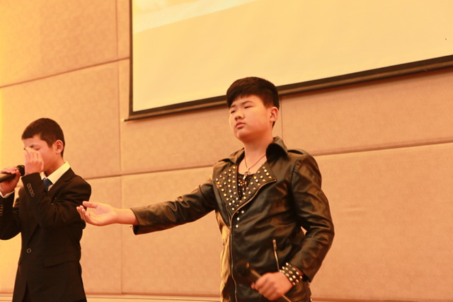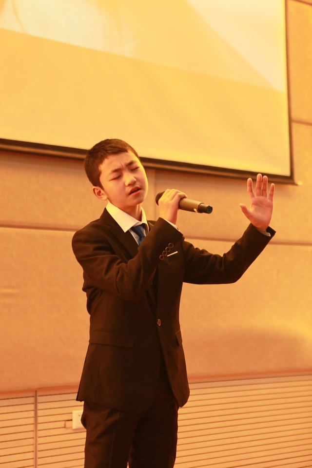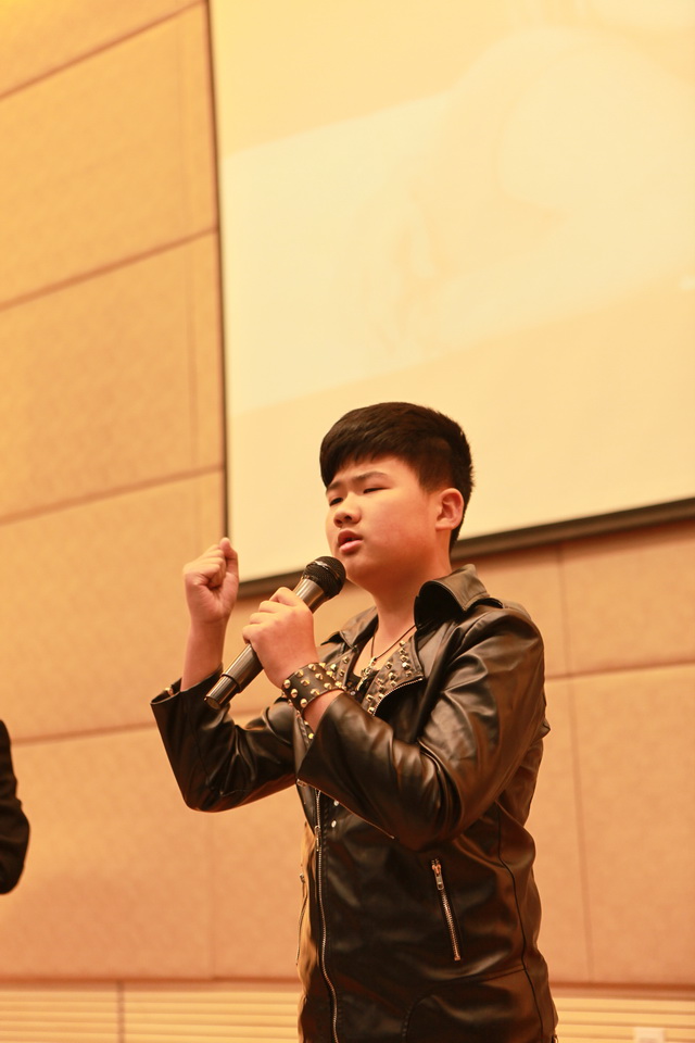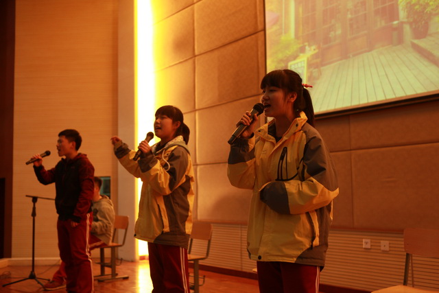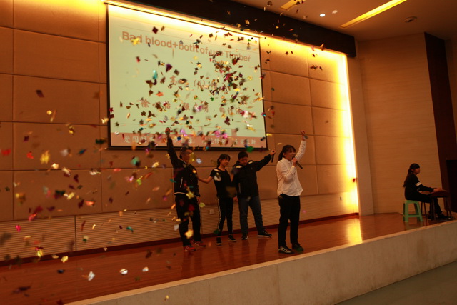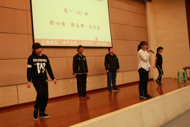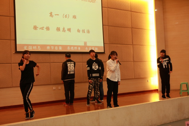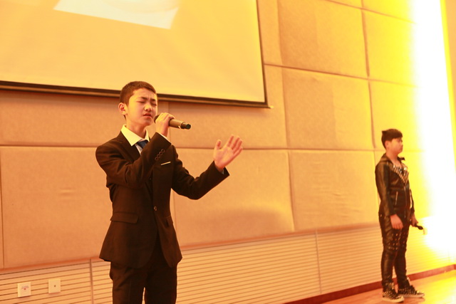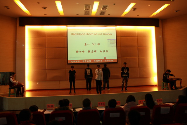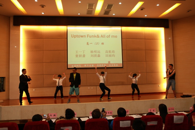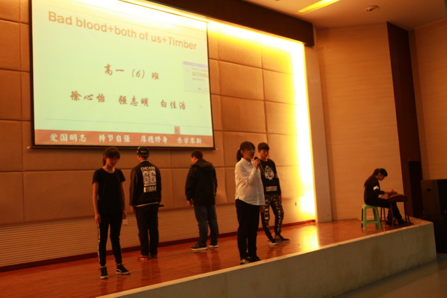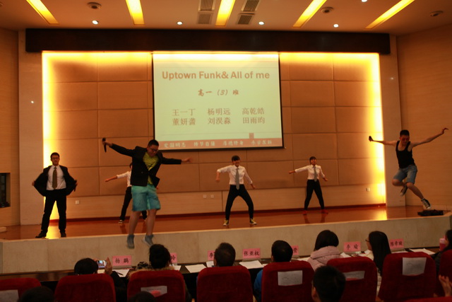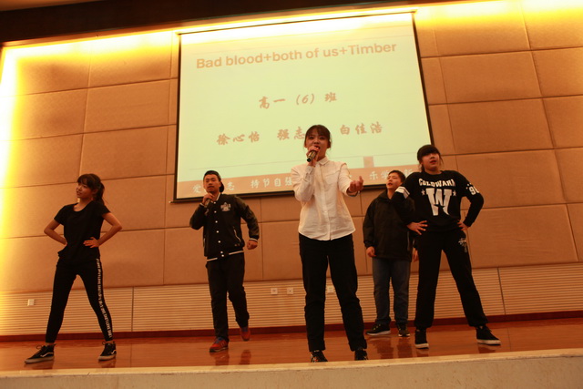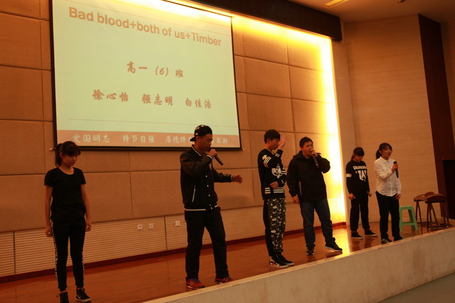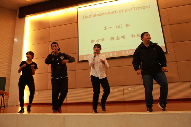 最激动人心的是最后一个环节——英文歌曲演唱。高二(4)班为大家带来的《Two is better than one》优美动听。初二(1班)班的《See You Again》震撼全场。初二(2)班所带来的《Cups》用杯子,演绎了全新的音乐篇章。初一(9)班的《You raise me up》让全场的观众为之感动。高一(6)班的《Both of us+Love the way you lie+Timber》将中国悠扬的古典歌曲与西方激情四射的说唱和Beatbox所结合,给现场的观众听觉的震撼与冲击。高一(3)班的《Uptown Funk& All of me》将现场的气氛推向了高潮。
