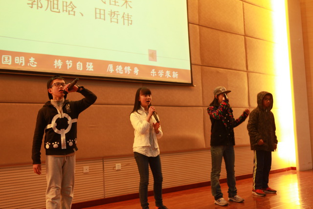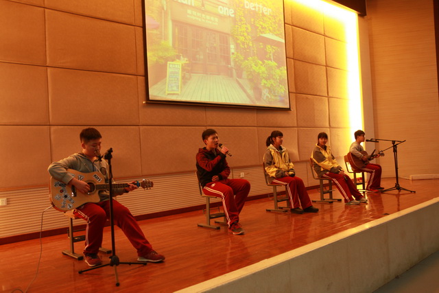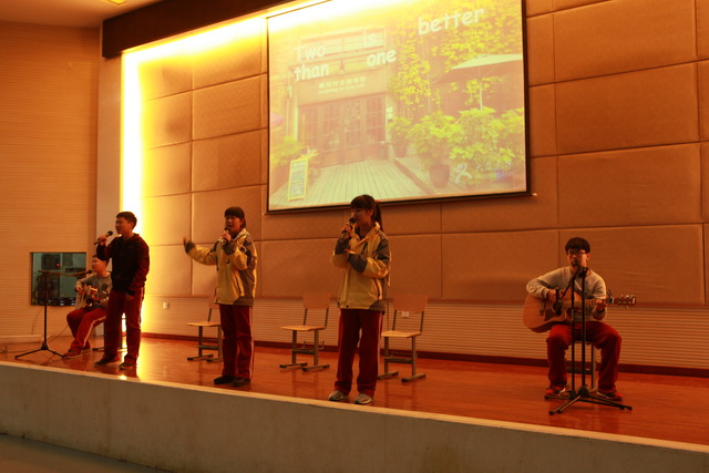 高2017届4班吕彬、屈家鼎、尚雨正春、孙美欣、孙域杰演唱英文歌曲《Two is better than one》