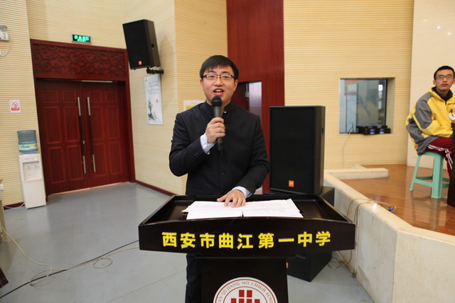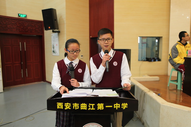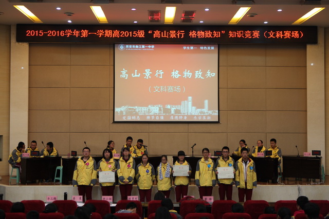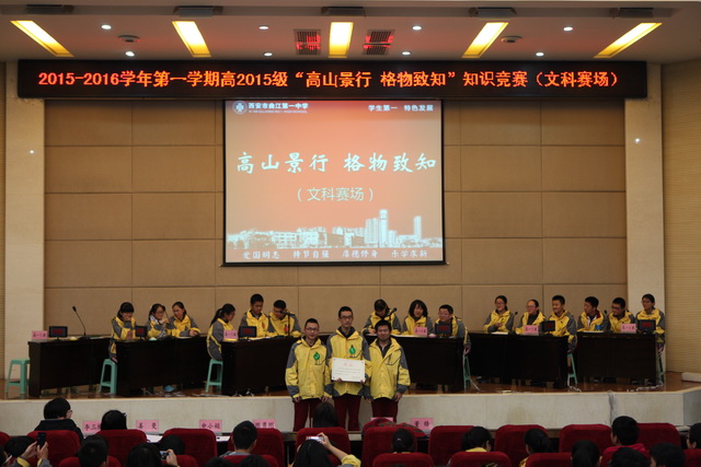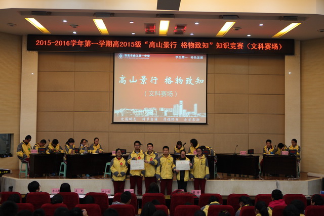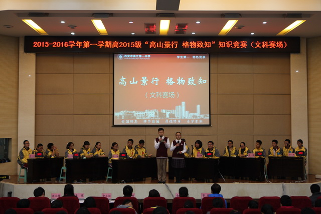 11月28日上午10点,高2015级“高山景行,格物致知”学生知识竞赛文科赛场比赛在曲江一中报告厅顺利开展。本次知识竞赛各班共派出6支代表队参赛,全体师生参与观摩了此次比赛。常务副校长陈勇刚,校办兼政教处主任余爱东,校办副主任申小娟,高一年级组长董锋,语文教研组组长金慧,政治教师李三梅和历史教师姜曼莅临本次竞赛并担任赛会评委。本次竞赛由高一四班王鹏威、李佳懿主持。
