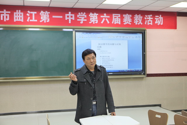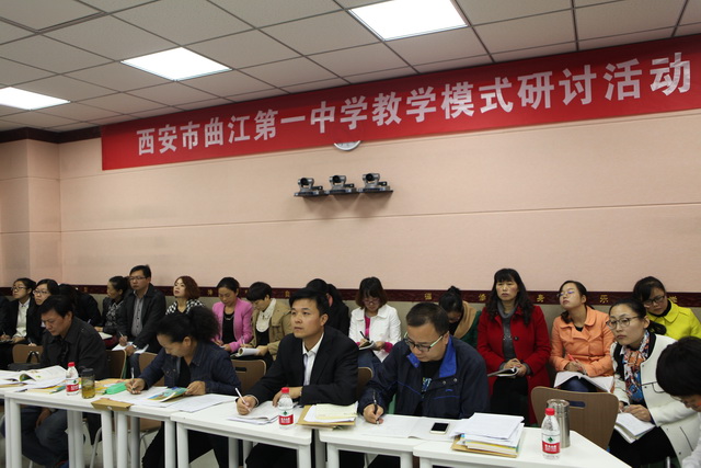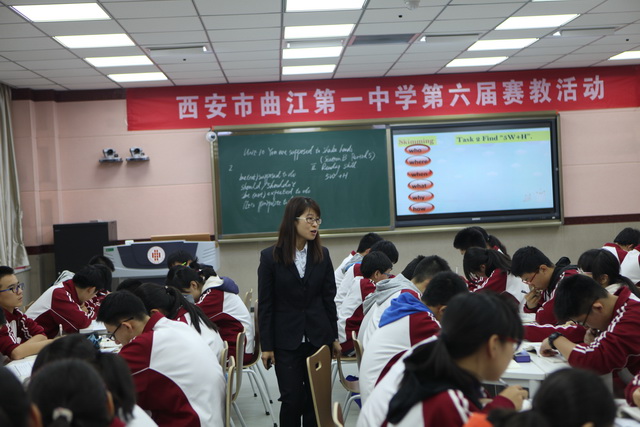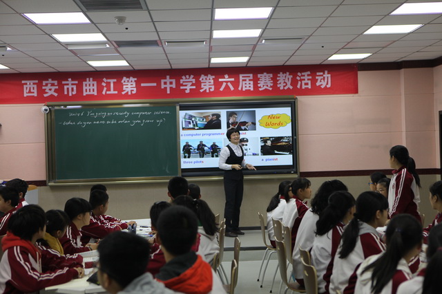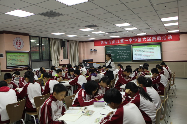 2015年10月28日,曲江一中第六届赛教活动(初中组)进入第三天的激烈角逐中。本次比赛特邀陕西师范大学段亚绒教授、雁塔区英语教研员袁晖老师、曲江一中英语教研组长张亚权老师以及陕西省教学能手李新定老师担任评委。安康市汉阴县漩涡初级中学、石泉县城关中学、石泉县后柳中学、石泉县池河中学、西安市第四十五中的部分英语老师以及我校的全体英语教师观摩了本次比赛。