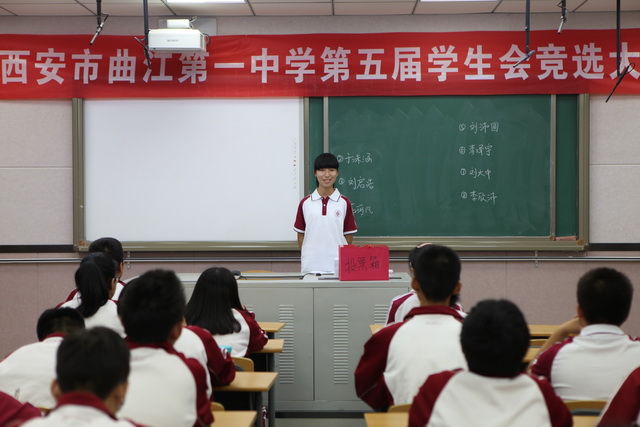 杨浩霖宣读了《西安市曲江一中学生会换届选举办法》,随即候选人竞职演讲正式开始。参加竞选的7名同学激情飞扬,侃侃而谈,淋漓尽致地展现了自己的文采、能力与口才,表达出了自己的豪情壮志以及对学生会今后发展的一番见解与计划,精彩的演讲不时博得阵阵喝彩,激情与拼搏贯穿了整个竞选过程。演讲过后7名候选人分别回答了评委以及学生代表提出的相关问题。经过激烈的角逐,经过评委公平评判以及学生代表投票,初步确定了李欣沛同学为学生会主席,于沫涵和花珂凡同学为学生会副主席。经校务会讨论无异议后,他们将正式参与学生会的管理。