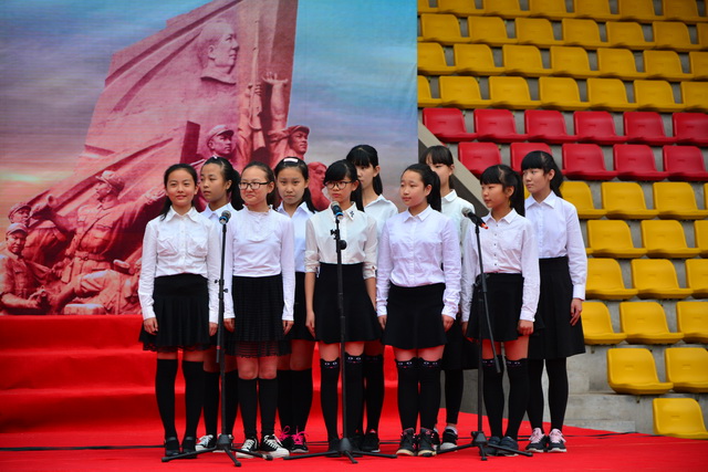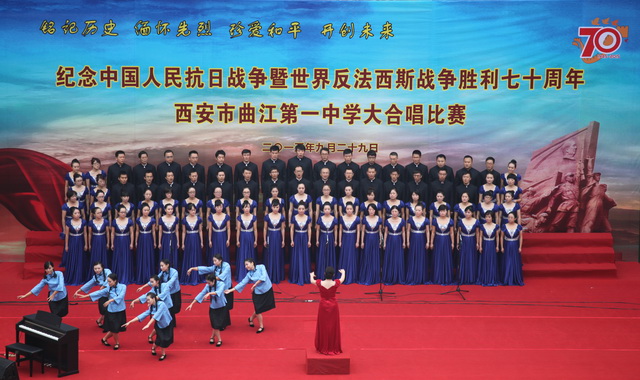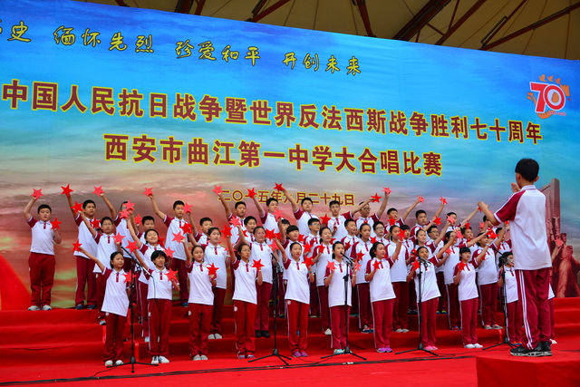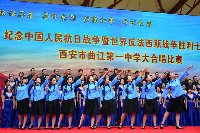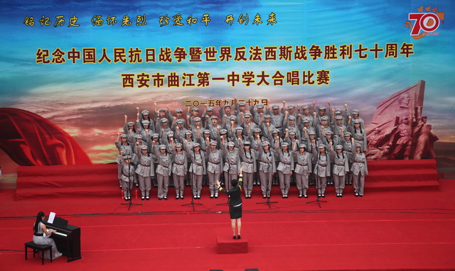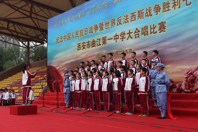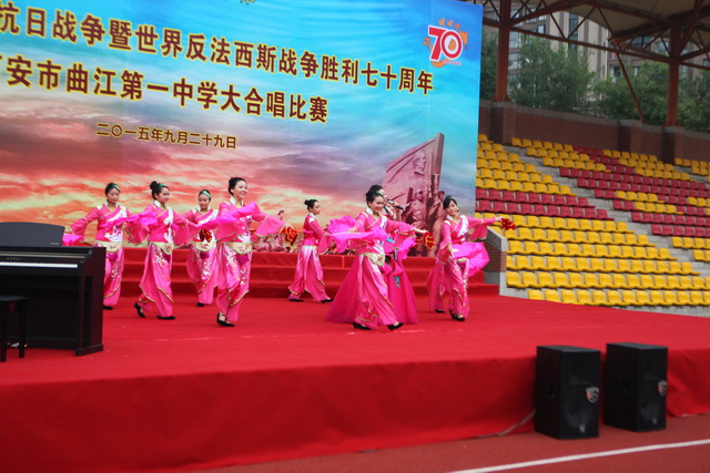 2015年是世界反法西斯战争胜利暨中国人民抗日战争胜利70周年,为弘扬以爱国主义为核心的民族精神,传承绵延五千年复兴民族的中国梦。2015年9月29日下午,在国庆66周年来临前夕,曲江一中在校操场举行了“迎国庆向国旗献礼”暨纪念中国人民抗日战争世界反法西斯战争胜利七十周年大合唱比赛。