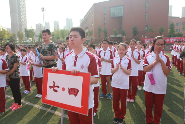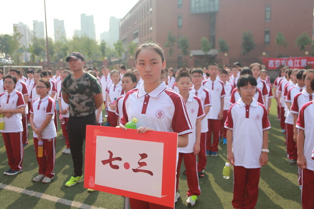 早上8:30,新生已经全部集合完毕,他们稚气未脱,却自信满满;他们好奇活泼,但步伐整齐,在班主任老师的带领下前往操场参加开营仪式。仪式由年级组长张洁老师主持,政教处主任余爱东老师慷慨激昂,宣讲了此次训练活动对于学生的意义、目的,鼓励新生们上好这初中的第一课;教官刘华成老师严肃认真,代表全体教官表示一定严格纪律,扎实训练;学生代表齐天帅意气奋发,宣誓定会严格训练,完成任务,不负众望。现场秩序井然,气势昂扬。之后,初一全体学生即投入到紧张有序的训练中去。