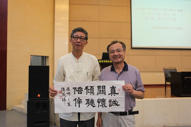 2015年7月6日上午8点30分,由我校主办的海峡两岸“读《论语》”师资研修班在曲江一中报告厅拉开帷幕。本次研修班主讲嘉宾为台湾新北市三民高中张荣焜老师、台北市丽山高中国文教师徐茂玮老师。来自45中、漩涡中学、后柳中学、池河中学等兄弟学校的领导、老师与我校教职员工齐聚一堂,聆听国学教育智慧。