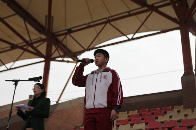 早晨9:50,升旗仪式准时开始。国旗护卫队迈着整齐的步伐走向旗台,在庄严的国歌声中,五星红旗冉冉升起。初二一班魏可名同学作了题为《勤学》的国旗下讲话。初二二班权一杨同学宣读了值周总结。随后,学生会纪检部孙佳钰同学宣读上周对值周班级监督检查结果。接着,刘瑜老师宣读了上周宿舍检查结果。最后,全校学生在初二一班周靖淳同学的领诵下齐声诵读,结束了本周升旗仪式。