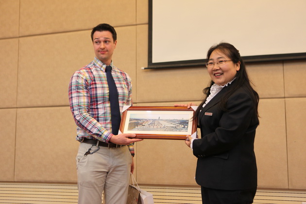 余主任代表曲江一中向美国哥伦布学校赠送纪念品