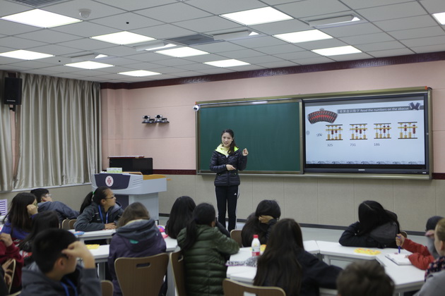 曲江一中梁瑞静老师为美国尤方玉屏学校学生讲授《珠算》