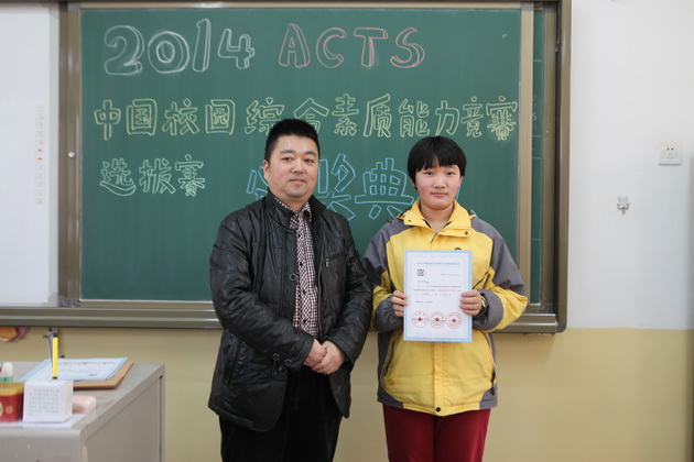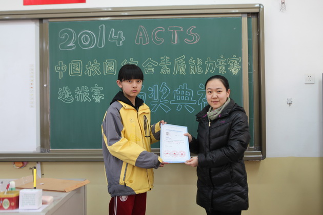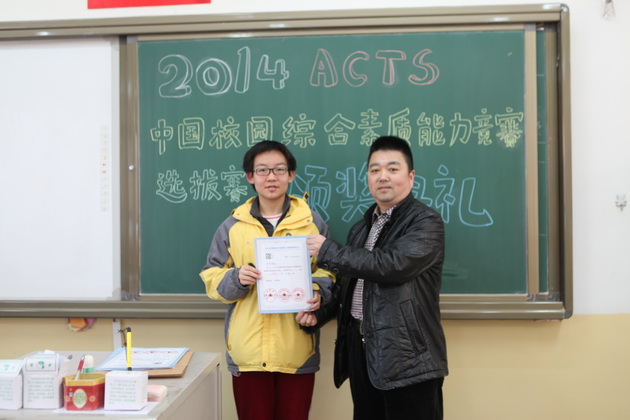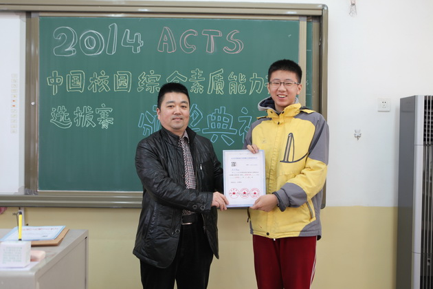 曲江一中九年级学生李亦晨、沈键儒、刘采博、易小雨、贾麒冉、王新烨、田雨欣、辛思源、严梓艺、朱梓源、周雅婷、吕尚一、张钊源,八年级学生郝宇翔、李琦昱、赵静雅等16位同学在2014ACTS中国校园综合素质能力竞赛陕西赛区取得了1金8银11铜的好成绩,李亚鹏老师荣获“优秀指导教师”荣誉称号。