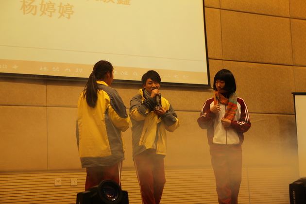 比赛在4位主持人激情洋溢的开场中拉开了帷幕,赛场上气氛热烈,所有选手精神抖擞、神采飞扬。此次英语风采大赛分为六部分: “个人演讲”、“情景对话”、“电影配音”、“英文歌曲演唱”、“英文歌曲合唱”与“创意节目”六个环节。在“个人演讲”环节中,选手们围绕着《We Have Only One Earth to Live On》和《What Makes A High School Student Cool?》两个主题进行了精彩绝伦的演讲。每个选手在此轮比赛中都表现的非常出色,博得台下热烈的掌声。 “情景对话”中各班选手表现得诙谐幽默,生动有趣,富有吸引力,该环节,每个选手各展所长,逗得台下的同学捧腹不止。 “电影配音”时,各班都极其生动地展现了电影情景,惟妙惟肖的表演,让观众身临其境。“英文歌曲演唱”环节,选手们载歌载舞,会场气氛一下子就给调动起来,将比赛推向了高潮。“英文歌曲合唱”环节,各班力展班级风采和特色,文科班的诗情画意,理科班的虎虎生威展现的淋漓尽致。最后在郝雨欣同学的英文歌曲《Imagine me without you》中比赛落下帷幕。