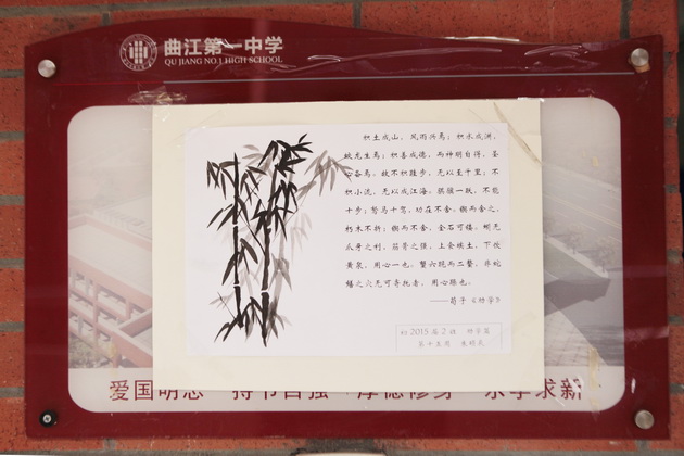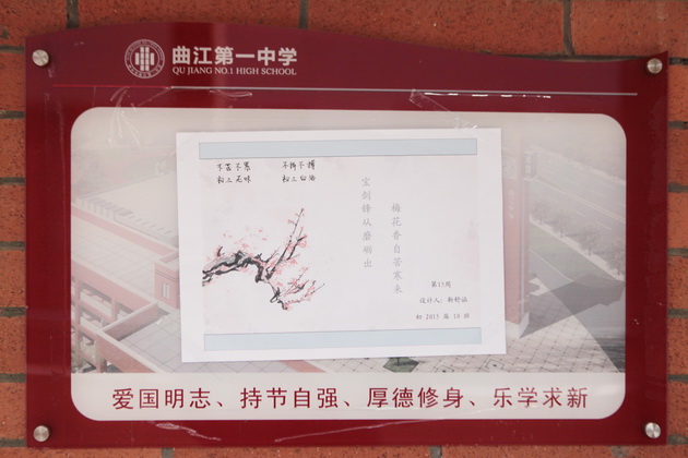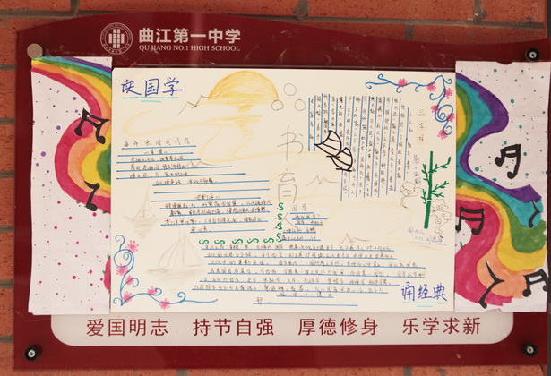 优秀的班级名片是学校校园文化建设的重要组成部分,是展示学校校风和学风的一个亮丽窗口,也是班级风貌的标志之一。为加强各班学风班貌建设,美化育人环境,发挥环境对学生思想品德教育的熏陶作用,培养学生的集体主义意识,激发学生创新求进的激情,进一步推进和提升学校班集体建设和校园文化品位,增强教师的责任和学生的团队精神,促进国学传统文化教育建设丰富校园文化打造特色班级文化。自12月1日以来,在曲江一中政教处的精心策划下,各年级举办了以“国学”为主题的班级名片设计展示活动。各年级师生共同分析了进行班级名片设计中会遇到的问题和解决方案。本次活动,一方面增强了各年级师生对班级文化建设的认识,加强了师生间的情谊。另一方面,这次活动也丰富了学生的课外生活,增强了各班级学生的凝聚力。