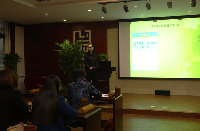 首先分享的是李慧、杨帆两位老师。她们在11月上旬参加第五届全国中学语文说课大赛,李慧老师的《谈中国诗》荣获一等奖,杨帆老师的《让笔下无过客——初中写作系列教学》荣获特等奖。在今天的培训中,她们首先原汁原味地重现了她们的说课。紧接着,李慧老师从说课评价的角度,以自己的说课为例,向老师们讲解了一堂好的说课应具备的要素。杨帆老师则从自己准备说课、参与比赛的过程出发,谈到了团队合作、相互学习的重要性。生动的示范和入情入理的讲解给在场所有老师以启示。
