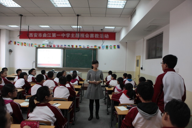 2014年10月16日至10月17日,我校在录课教室举行了主题班会赛教活动。这次活动以社会主义核心价值观24字方针为主题,旨在进一步加强学生对其的理解和实践。本次活动特邀陕师大附中副校长张帆、政教处主任邓小鹰、专业心理学教师岑坚、学校办公室兼政教处主任余爱东、政教处副主任刘瑜担任评委。初中六位班主任、高中四位班主任分别从不同角度给学生上了一堂生动的公民教育课。