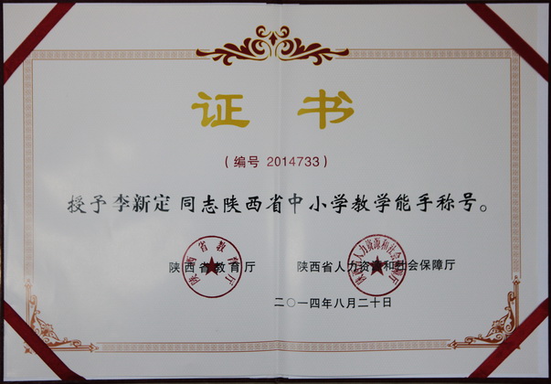 日前,陕西省教育厅、陕西省人力资源和社会保障厅联合颁发证书,授予我校高中部教师李新定“陕西省教学能手”称号。