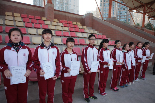早晨9:50,升旗仪式准时开始。国旗护卫队迈着整齐的步伐走向旗台,在庄严的国歌声中,五星红旗冉冉升起。高二三班宋炜明同学作了题为《胸怀远大,心向阳光》的国旗下讲话。高二二班秦晨同学宣读了值周总结。接着,刘瑜老师宣读了由西安市创文办、西安市文明局、西安市教育局发起的创建文明城市倡议书。随后,刘瑜老师宣读了上周宿舍检查结果。最后,学校常务副校长陈勇刚为我校在2014陕西省中小学拼词大赛暨第88届美国拼词大赛陕西赛区比赛中5名同学成功晋级和10名同学荣获优秀奖的同学颁发荣誉证书。