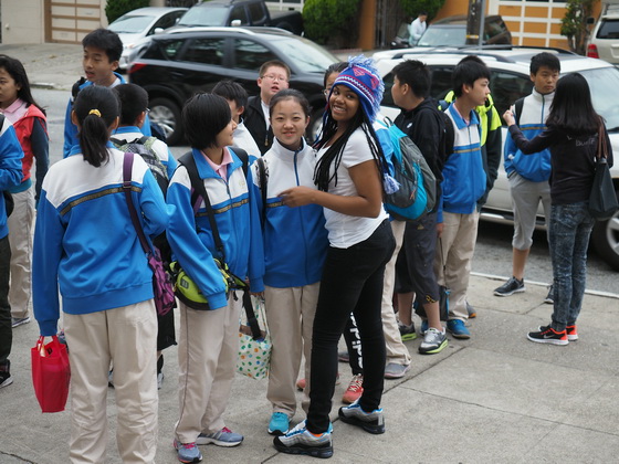 在旧金山与尤方玉屏学校的交流回访,以及入住寄宿家庭,是孩子们最值得期待的体验。在去学校的路上,老师们就从与寄宿家庭及美国老师交往的礼仪,礼貌方面,从在美国家庭做客衣食住行日常规范方面,给同学们做了详细的介绍。餐桌礼仪,整理房间,如何提要求,如何委婉拒绝等,老师们结合自己的外事活动经验,以及同学们这两天的表现,生动形象地给大家做了要求。坦诚的讲,我们这批学生还是很好管理的,但是具有可能中国人固有的一些陋习。例如:任何场合都喜欢高声聊天;走路扎堆,占满了整个路马路等。我们也曾遇到美国小学生夏令营,十多个7-10岁的孩子在排队的时候安安静静,没有追逐打闹,更没有高谈阔论,老师也很少管理,甚至训斥。相比之下我们的孩子在说话办事时,对别人感受的关注度很是欠缺。老师需要不停地提醒才能改进。还好,同学们还听话。看来整体素质的提高需要我们全社会,家长、老师共同努力,希望这个过程不会太长。