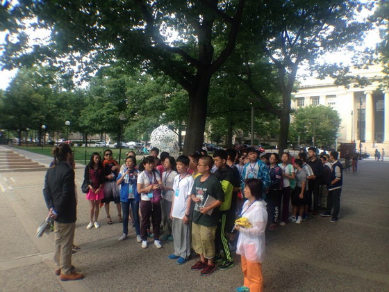 华盛顿的国会山,五角大楼,白宫,都在眼前掠过。纽约作为世界的经济中心之一,高楼林立,人头攒动。自由女神像好像永远向大家召唤着,来吧,来美国圆梦吧。洛克菲乐大厦,第五大道,闻名世界的纽约证券交易中心,以及站在帝国大厦俯瞰整个麦哈顿时那种气派、那种震撼不是能用只言片语所能描述的。同学们哇哇大叫,太美了,真棒,不虚此行。波士顿周围据说大大小小的高校有100多所,不愧为大学城呀。东西海岸之行同学们参观了普林斯顿大学、哈佛、麻省理工、斯坦福、加州大学伯克利分校等世界级名校。总体的感觉,校园那叫一个美呀,如诗如画,学生如同在世外桃源,在童话般生活一样。拜占庭风格的古建筑很多都是石头外层,保留了上百年,绿草茵茵如地毯的胜景令我们同学们很是心驰神往。老师们找准时机鼓励孩子们,有朝一日也考到这里来读书。一个学生说这里太贵了。老师们赶快补充道,你只要能考上,父母砸锅卖铁都供你读。可怜天下父母心呀 ,同学们加油呀。