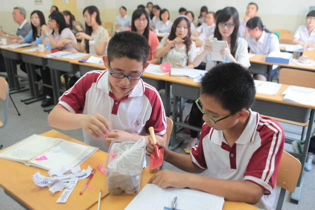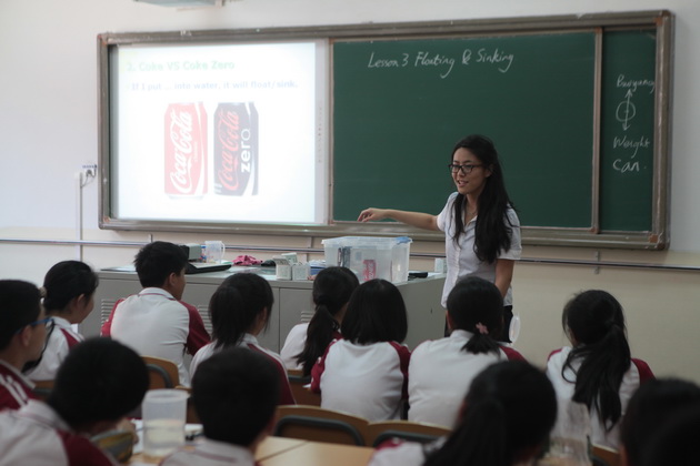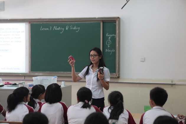 我校初二年级英语教师周瑾和外籍教师Sam给大家展示了两节不同风格的浸入式英语科学课程。第一节课是周瑾老师为大家展示了一节物理课“Floating and Sinking”课前通过热身小活动引入主题,以描述实验现象的方法归纳总结出浮与沉的定义, 然后对实验结果提出假设,通过计算找出造成浮与沉的原因。总之,这节科学实验课的设计从发现现象,提出假设,到最后验证结果,与科学的实验过程完全吻合,充分体现了浸入式英语课的科学性。Sam老师为大家带来了一节复习课“Air, Water and Wind”。Sam老师丰富的肢体语言和热情感染了在场的每一个人,多样的活动设计别出心裁,锻炼学生动手能力的同时,让学生对浸入式英语课程产生了浓厚的兴趣。