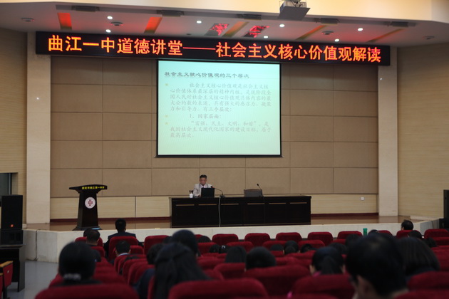 为了弘扬社会主义核心价值观,全面提升全体教职工的道德素质,围绕第十三个公民道德建设月主题,4月16日,日下午,一场以“社会主义核心价值观”为主题的道德讲堂在曲江一中正式开讲。
