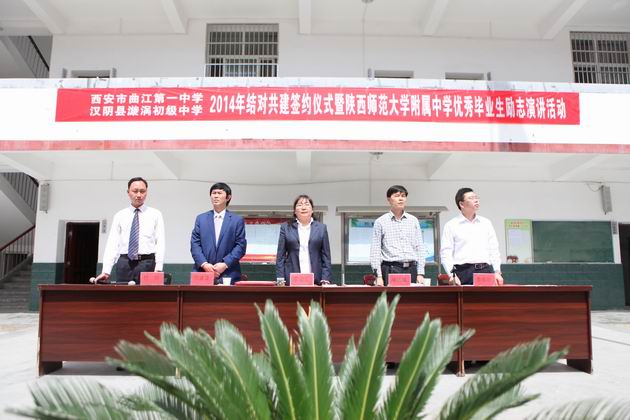 14时20分,受曲江一中校长边团结委托,学校办公室兼政教处主任余爱东代表学校与漩涡初级中学签订了2014至2017年两校结对共建协议。汉阴县体育教育局副局长喻达斌、汉阴县体育教育局教研室主任张建谟、汉阴县平梁中学校长钟正及汉阴县漩涡中学的全体教师共同出席了本次签约仪式。本次签约仪式,由漩涡初级中学副校长付刚同志主持。