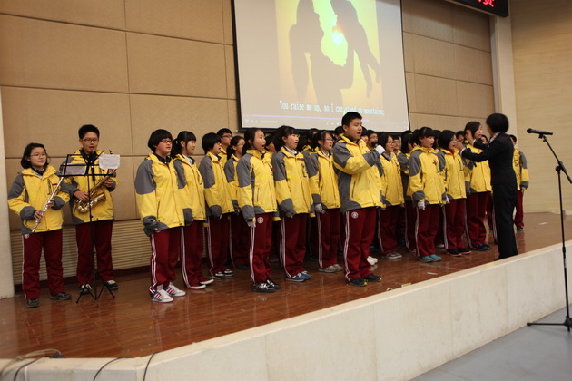 第四部分——英文歌曲演唱。各班代表大显身手,或独唱,或乐器伴奏,或小乐队表演展现了新时代少年的素质和才艺。每逢有同学台上唱歌时,台下同班同学持续鼓掌呐喊,一次次将大赛气氛推向高潮。其中4班的双人合唱,节奏轻快,声音恬静,小清新特点在年级表演中令人耳目一新。