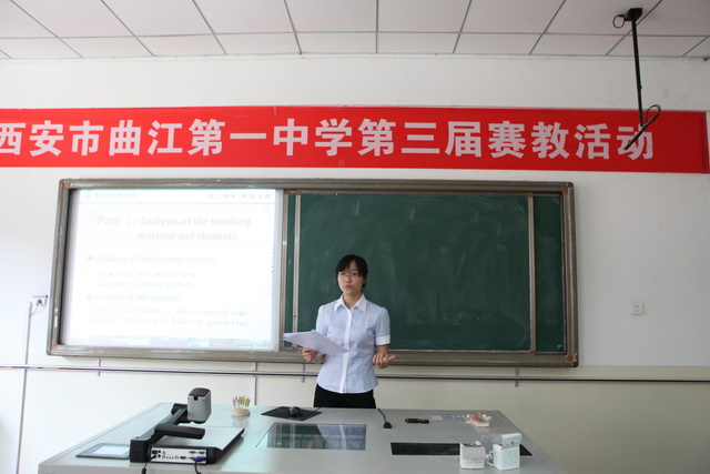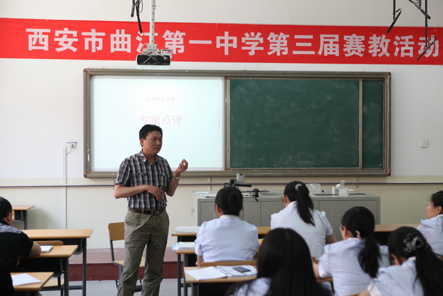 2013年5月20日至23日,我校在直录教室举行了第三届赛教活动。我校语、数、英等12门学科26位教师分别参加了比赛,本次赛教活动特邀陕师大附中工会主席兼政教处主任邓小鹰及各学科带头人担任评委,我校常务副校长陈勇刚、副校长曹琦、学校办公室兼政教处主任余爱东、教务处兼招生办主任朱琳瑛、教务处兼高2013届年级组长高秋棉、教研室兼高2015届年级组长刘公潜、各年级组长、各教研组长及各学科教师观摩了这次比赛。