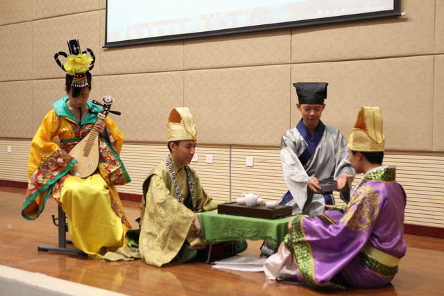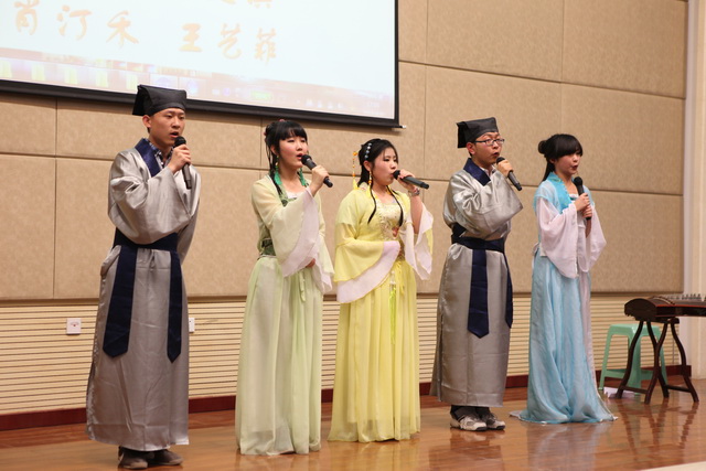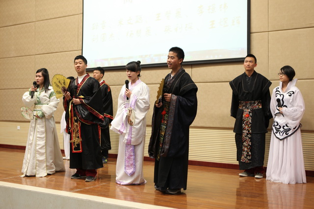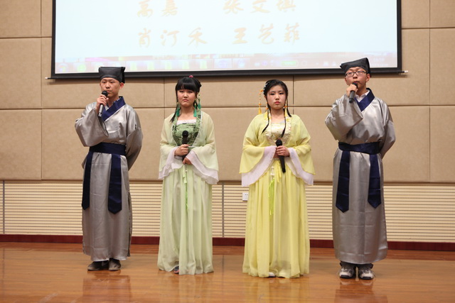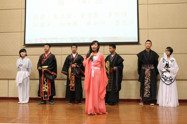 比赛分为四个环节:集体诵读、心心相印、个性诵读、即兴演讲。集体诵读环节,各班按顺序依次出场,高声齐诵经典华章。一首《蜀道难》道尽天路艰险,《宣州谢朓楼饯别校书叔云》的壮思逸情深情感人,典雅大方的《卫风·氓》,豪情万丈的《短歌行》更是赢得观众掌声一片。心心相印环节尽数展现学生的国学积淀,机智的比划、形象的语言足见学生的聪慧与用心。个性诵读环节更是精彩不断,先有高一·一班的《琵琶行》诵读与情景剧结合,构思巧妙,精心准备可见一般;再有高一·二班的《长恨歌》展示形式多样,诵舞结合,更有琴声依依,渲染情境韵味十足;高一·三班再演《蜀道难》的气势澎湃,让人鼓掌叫绝,高一·四班、五班的《代白头翁》、《满江红》的诗、歌同台更是精彩不断。