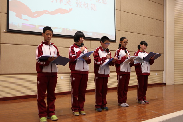 比赛在五班同学铿锵有力的《过零丁洋》朗诵中拉开帷幕,各班同学欲与天公试比高,诵读声一波胜比一波,犹如江海之势,或滚滚滔滔,或低迷凄婉,余音袅袅。心心相印环节中,孩子们尽显智者之灵气与才干,惹得全场唏嘘不已,掌声不断。比赛很快就到孩子们最喜欢的个性诵读阶段了,脱下校服的孩子们,穿着精心准备的裙裾长褂,伴着悠悠古筝之声,旋动他们曼妙的舞姿。五班同学一首悲壮狂放的《将进酒》道尽满腔愁苦;三班同学一曲凄迷伤怀的《凤凰惊鸿》诵尽淡淡哀伤,一班同学一篇逼真传神的《渔父》让人刮目相看。欢呼声中,迎来了最具挑战的即兴演讲环节,七班韩笑丛的落落大方赢得全场屏气凝神,九班庞雨佳的聪明机智博得喝彩连连。
