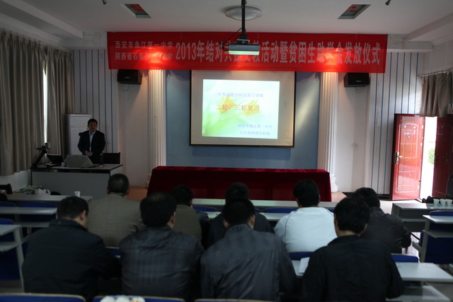 4月23日清晨,我校初2013届英语教师龚静、数学教师冯俊、物理教师崔敏在学校办公室兼政教处主任余爱东的带领下奔赴石泉县后柳中学进行2013年支教活动暨贫困生助学金发放仪式。余主任一行得到了后柳中学校长曾云峰和原后柳中学校长邱礼建、教研室邓主任及各学科老师的热烈欢迎。