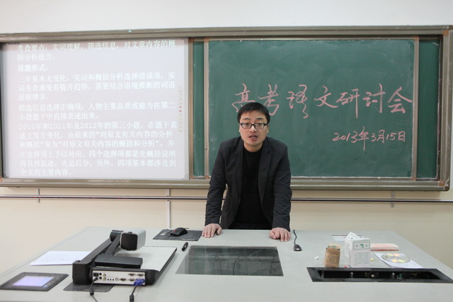 会议的第一项是由高三语文老师的代表乔亚龙老师汇报本年级的备考工作及冲刺阶段的复习计划。乔老师首先对今年的考纲进行了解读,之后根据近三年的高考试卷按题型进行分析,并提出了相应的复习对策,最后根据年级学生的具体情况提出了高考冲刺阶段的复习计划和方法,重点突出,详细实用。