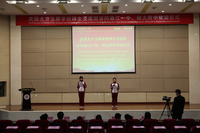 欢迎仪式上,师大附中党总支副书记兼曲江一中常务副校长首先致欢迎辞,在表达了对远道而来的朋友诚挚欢迎之意的同时,他希望中美双方学生能在此次交流活动通过多种方式更深入了解两国文化,结下深厚情谊,搭起友谊之桥。随后,美国尤方玉屏学校司徒校长致答谢辞。在简要的自我介绍之后,她表示非常感谢有这个机会能让中美两校学生进行深入交流。在这个有着悠久历史的城市里,她相信学生会学到更多知识,更努力地了解中国的历史文化与日常生活,领略中国古地的文化与魅力。