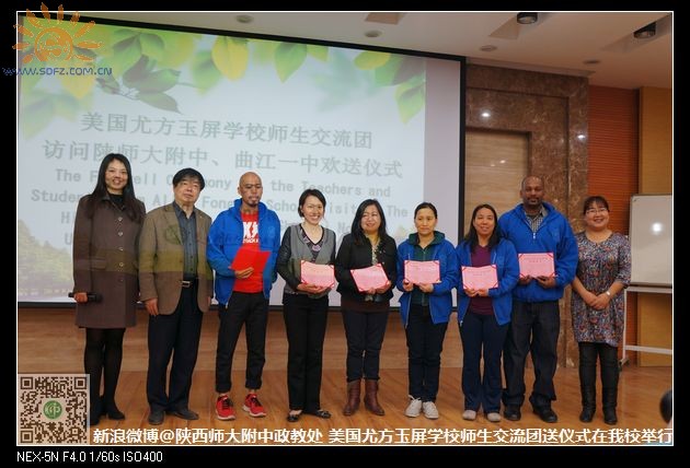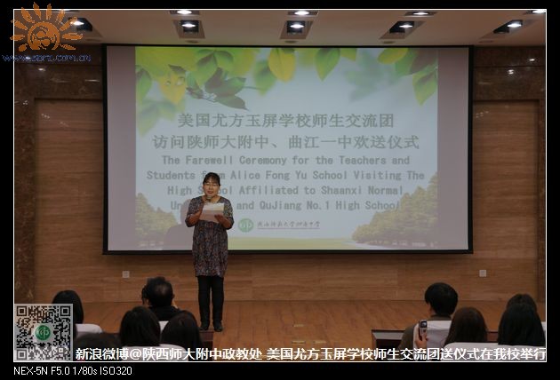 欢送仪式上,陕师大附中政教副主任高姗首先致欢送辞,在表达了对远道而来的朋友诚挚欢迎之意的同时,她表示中美双方学生在此活动中通过多种方式更深入地了解了两国文化,结下了深厚情谊,搭起了友谊之桥,这次活动给两国学生提供了很好的学习和交流平台,希望以后能加强两国学生师生之间的交流。接着,尤方玉屏学校的杨诗敏同学上台讲了自己在西安这四天的所见所闻以及对西安这座古都的感受。随后,尤方玉屏学校的司徒校长上台发表了感言。在此之后,陕师大附中、曲江一中给美国同学颁发了“home stay”证书,双方学校与尤方玉屏学校还互赠了礼物,表达了双方学校的友谊。最后,曲江一中的政教主任余爱东老师,以诗代柳,送别了美国学生,两校在场学生全体起立,集体诵读了《送杜少府之任蜀州》。仪式结束后,双方学生在报告厅前合影留念,把师生之间的情谊永驻在照片中。