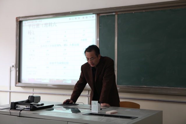 常务副校长陈勇刚、副校长曹琦、教务处主任朱琳瑛、学校办公室兼政教处主任余爱东、教研室副主任兼高一年级组长刘公潜就各自蹲点年级分别从班级的整体情况、各学科的成绩、各班级进入年级前30%的人数和班级的整体情况对初、高中六个年级的考试成绩进行了详尽的分析。