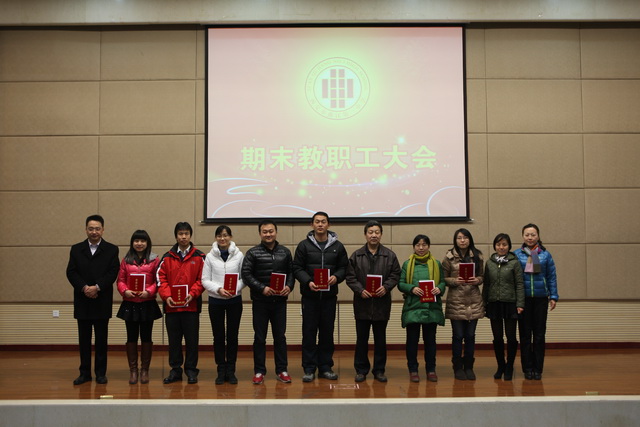 会议由常务副校长陈勇刚主持,首先, 副校长曹琦宣布了表彰决定,白国强、白璇、崔敏、丁慧芸等46位老师荣获本学年年度考核优秀教职工奖;大会第二项是对本学年在国内外期刊上发表论文的老师的表彰仪式,由教务主任朱琳瑛宣读了获奖教师名单,杜培蓓、何岩、黄晨、李慧等老师代表上台领奖。最后,政教处主任余爱东宣读了初中主题班会赛教获奖名单,并对苏岳老师在 “首届全国中小学班会课专题研修现场会”的良好表现进行了表扬。