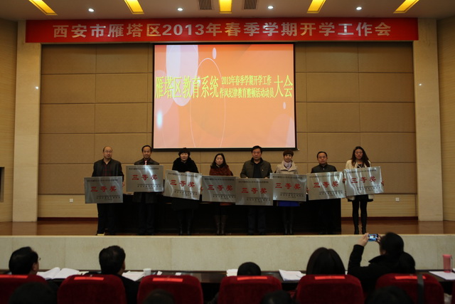 2月21日上午,雁塔区教育系统2013年春季学期开学工作与作风纪律教育整顿活动动员大会在我校召开,参加此次大会的有区教育局局长孙娥、区教育局党委书记张水利、区教育局副局长徐三雄及区各中小学、幼儿园的校长、园长及负责人,大会由区教育局党委书记张水利主持。