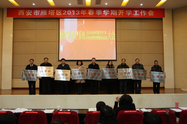 大会首先由区教育局副局长徐三雄作雁塔区2012年教育工作总结,并安排部署了2013年相关工作;随后,区教育局党委书记张水利通报表彰了2012年省级素质教育优秀学校、省级教育督导先进区县、个人,并通报了西安市实施市级素质教育优秀学校、市大学区管理制改革先进区县、学区长、成员学校、表彰了雁塔区2012年中小学目标管理考核先进单位等多项表彰决定。我校校长边团结分别代表师大附中、曲江一中上台领取了2012年中小学目标管理考核一等奖、二等奖;区教育局党委书记张水利还宣读了区教育系统作风纪律教育整顿活动的实施方案。