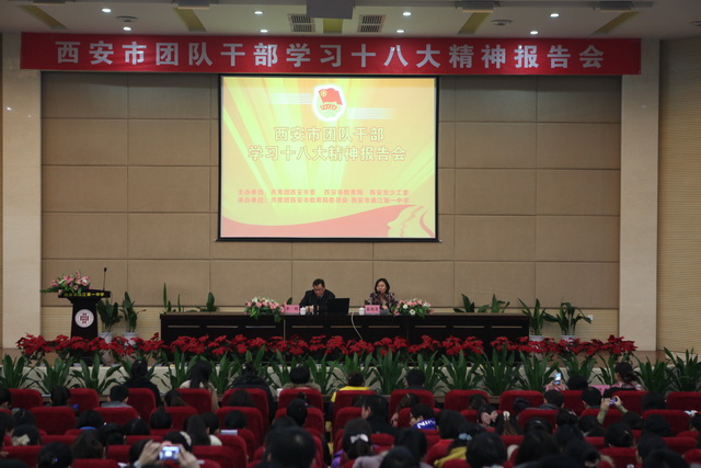 为深入贯彻党的十八大精神,落实《共青团中央关于深入学习宣传贯彻党的十八大精神,狠抓团的自身建设,团结动员广大青年团员在全面建成小康社会进程中充分发挥生力军作用的决议》要求,增强团队组织的战斗力和凝聚力,推动团队工作进一步围绕中心健康发展。共青团西安市委、西安市教育局、西安市少工委决定联合举办西安市团队干部学习十八大精神报告会。此次报告会由共青团西安市教育局委员会、曲江一中承办。