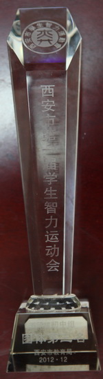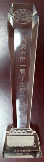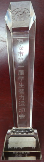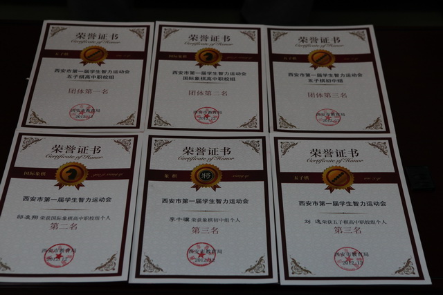 西安市第一届学生智力运动会于2012年11月24、25日,12月1日、2日在西安市高新逸翠园学校举行。比赛共设围棋、国际象棋、国际跳棋、中国象棋、五子棋五个大项。我校30名学生参加了围棋、五子棋、象棋、国际象棋四个大项的角逐。在比赛中我校学生发扬努力拼搏,积极进取的精神,坚持友谊第一、比赛第二的原则,与其他学校的参赛选手进行了激烈的角逐。经过四天的比赛,我校代表队取得了优异的成绩,共取得棋类比赛团体奖3个,个人奖3个。具体比赛成绩如下: