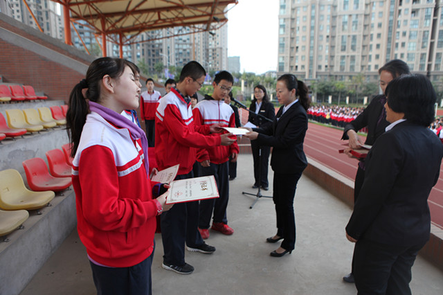 早晨7:40,升旗仪式准时开始。在庄严的国歌声中,五星红旗冉冉升起。随后,高2014届2班的刘雨晴同学作了题为“由小见大——勿以恶小而为之”的国旗下讲话。高2014届1班的袁迪同学宣读了上周值周检查结果。政教处副主任刘瑜老师宣读了上周宿舍卫生检查结果。最后,学校领导为我校获得第六届“地球小博士”全国地理科技大赛“地球小博士”称号和一等奖的学生颁奖。