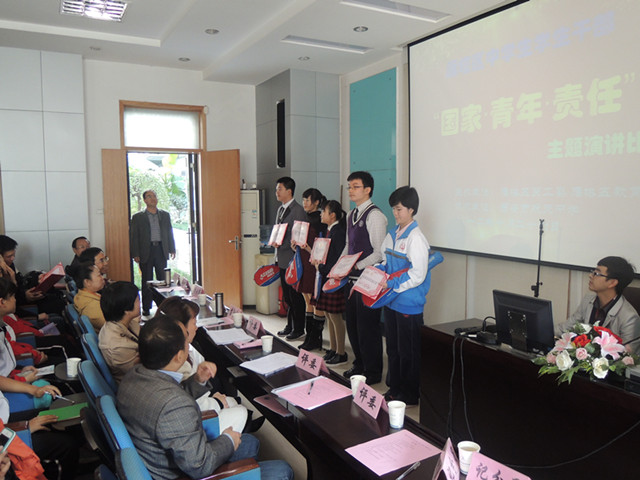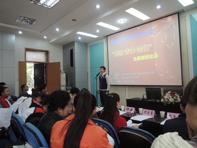 我校王宇飞同学的主题演讲题目为“书山立马向青春,学海遨游笑争流”,他用激扬的文字阐述了中国新青年的责任,飞扬的青春、理性的呼吁:以青春之我,创建青春之家庭,青春之国家,青春之民族。最后他寄语在场青年:书山立马,锦绣屏列,敢问青春无悔。学海遨游,不堪窥岸,笑傲百舸争流。充分展现了当代中学生干部的风采,同时也感染了现场观众,赢得阵阵掌声。