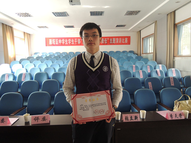 我校学生会主席、高二1班王宇飞同学获得一等奖殊荣