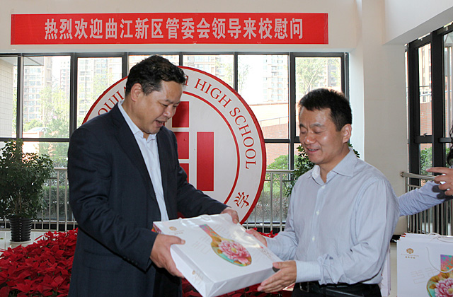 恰逢国庆歌盛世,月圆中秋送真情。2012年9月29日下午,西安曲江新区管委会主任李元,副主任邵峥嵘一行八人莅临曲江一中为全体教职工送来节日的祝福并发放节日慰问礼品。曲江新区管委会办公室主任孙超,教育卫生局局长郭军,办公室副主任范超、赵琳等领导一同参加了此次的慰问活动。