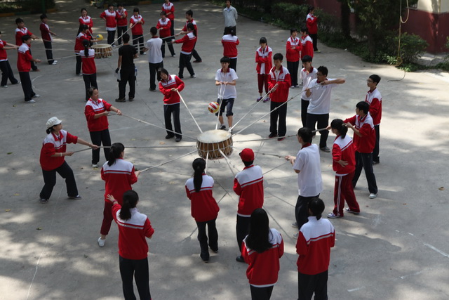接下来大家转移阵地,进行了激烈的“鼓动人心”。规则是队伍中的11个队员拉起鼓周围拴着的麻绳,由一位同学负责发球,大家要掌握好力度加强配合一起让球从鼓面弹起来,越多越好,并且俩队之间要进行PK。这更激发了大家的求胜心,在紧张的战术讨论和练习后,各队发球的准,鼓动的齐,捡球的快,加油的响,都取得了不错的成绩。