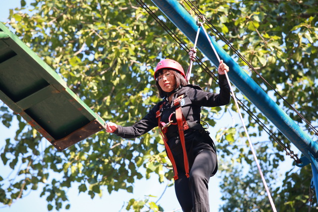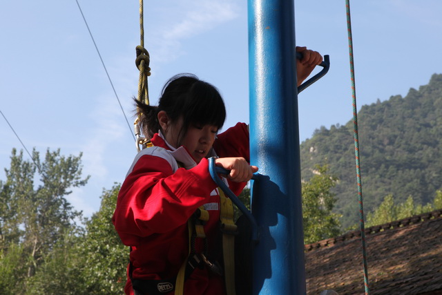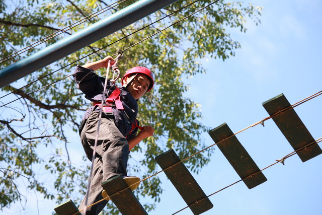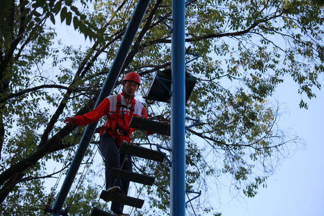 这短短的一天中同学们进行了许多有意义的活动。第一项活动就是让大家心里有些发怵的“断桥”。同学们要在八米的高空跨过断桥间1.2米的长度。经过教官认真细心的讲解各种注意事项,活动开始了。在大家的帮助下,上去的同学做好了安全措施,安全员也都到位,但晃悠悠的断桥还是让人害怕。这时全队的同学和教练员都大声呼喊着他的名字为他加油,终于一个又一个同学度过了难关,安全着陆。期间还有一些老师也跃跃欲试,在同学们的加油喝彩中体验了刺激的“高空历险”。