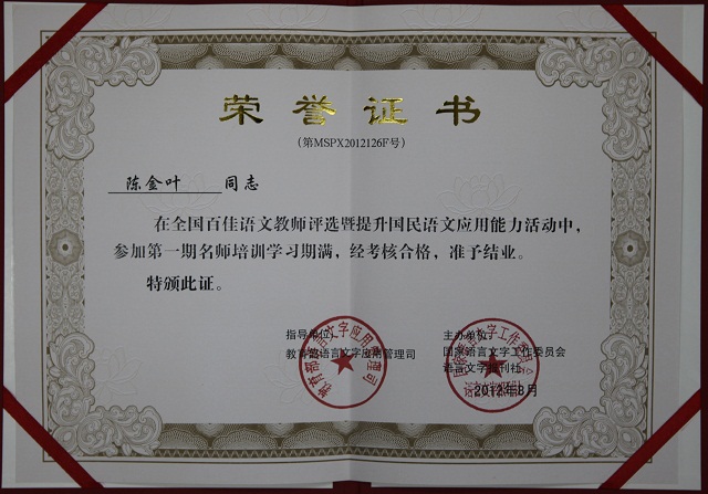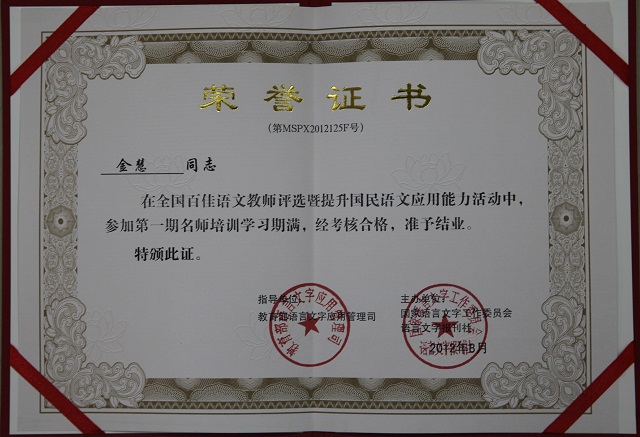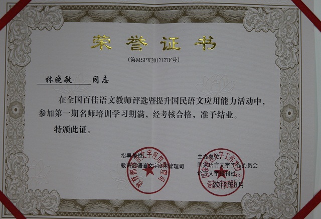 2012年8月3至5日,在语文组组长金慧老师的带领下,我校语文教师陈金叶、赵倩、林晓敏在北京参加了由教育部语言文字报刊社主办的“国民语文应用能力名师培训”。