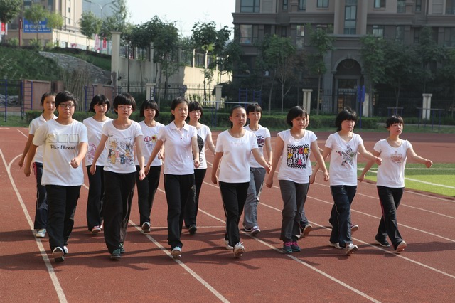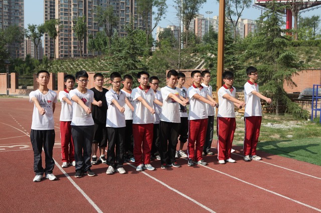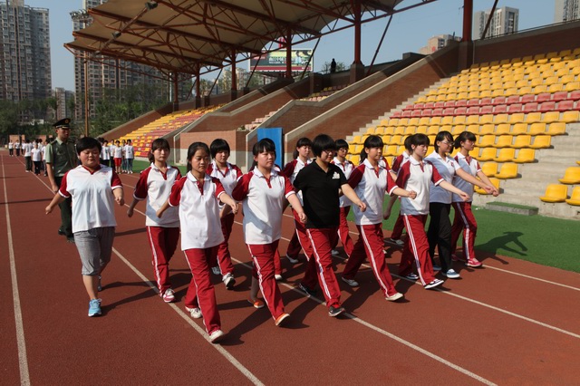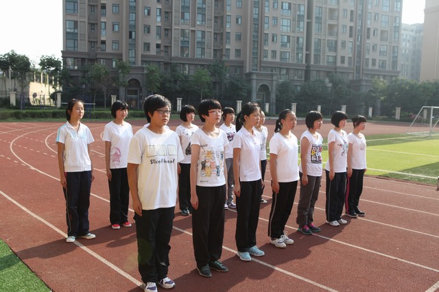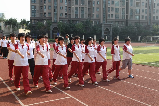 2012年8月29日6时,我校住校生在操场集结列队,开始了他们第二天的训练。今天,首先是军姿、队列动作和方阵的既定项目训练,然后是招式练习,男生训练的是擒敌,女生训练的是匕首术。