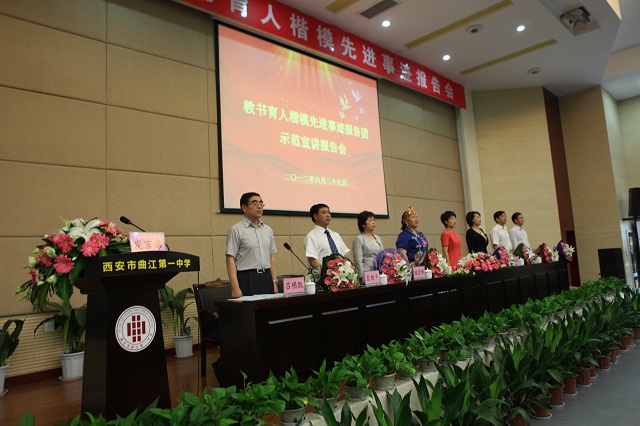 2012年6月29日, “教书育人楷模先进事迹报告团宣讲活动陕西西安报告会”在西安市曲江第一中学报告厅内召开。来自全国各地、不同岗位的五位老师——贵州省六盘水市盘县响水中学高级教师左相平,湖北省武汉市汉阳区钟家村小学中学高级教师、湖北省特级教师桂贤娣,新疆察布查尔锡伯自治县第一中学高级教师贺红岩,北京市第五幼儿园高级教师石利颖,浙江宁波达敏学校校长、中学高级教师、浙江省特级教师刘佳芬等五位老师,给我们带来了生动、精彩又令人震撼的一节课。