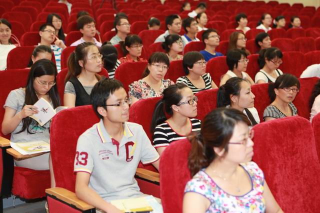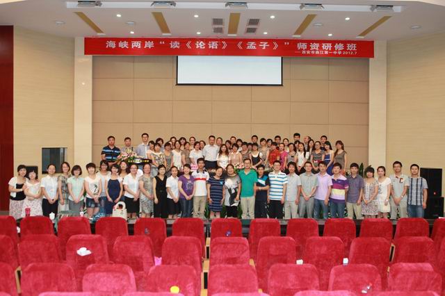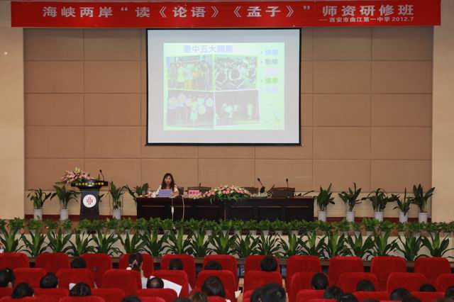2012年7月13日上午,在曲江一中报告厅,海峡两岸“读《论语》《孟子》”师资研修班活动特别邀请来自台湾新竹市立香山高中校长萧穗珍女士为大家讲解《论语》中的道德教化问题。此场研修培训由曲江一中办公室兼政教主任余爱东主持。