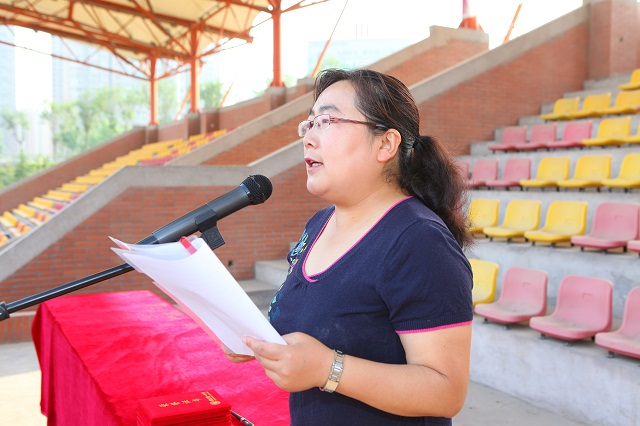 校办主兼政教主任余爱东主持“六一”诵经典活动暨少先队员退队新团员入团仪式