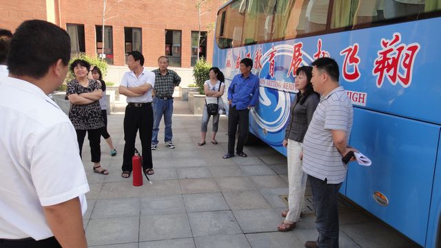 2012年5月30日下午, 总务处组织我校正在运营的所有校车司机,统一进行了一次校车消防安全知识现场培训会,就校车运行时的突发事件引起的火灾处理、乘员保护、逃生技巧做了详细学习。